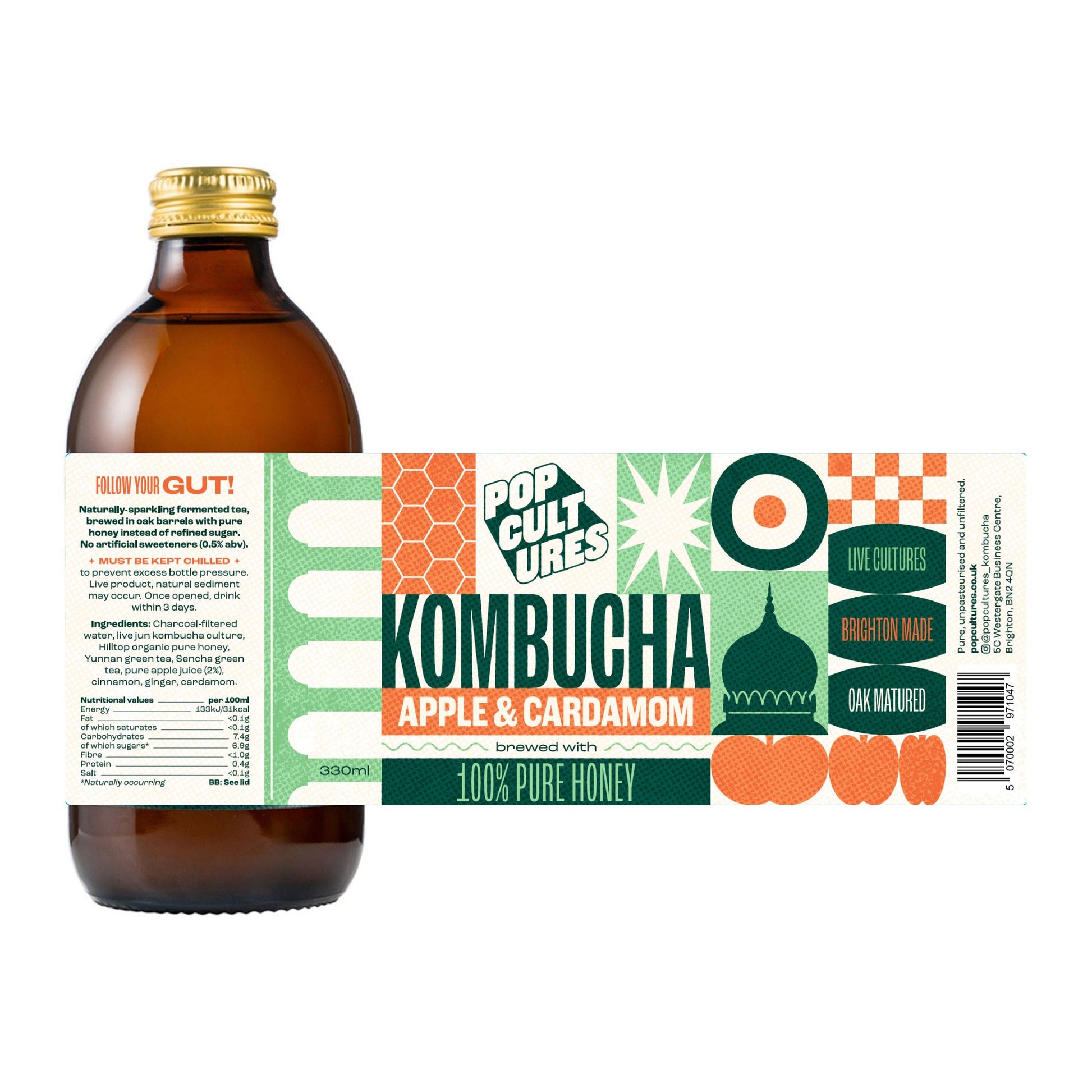 Freshly juiced ginger and lime give this Jun kombucha a proper zingy kick. Aged in oak barrels and brewed with 100% pure organic honey instead of refined sugar for a depth of flavour you won't find in conventional kombucha. Served in 330ml glass bottles.