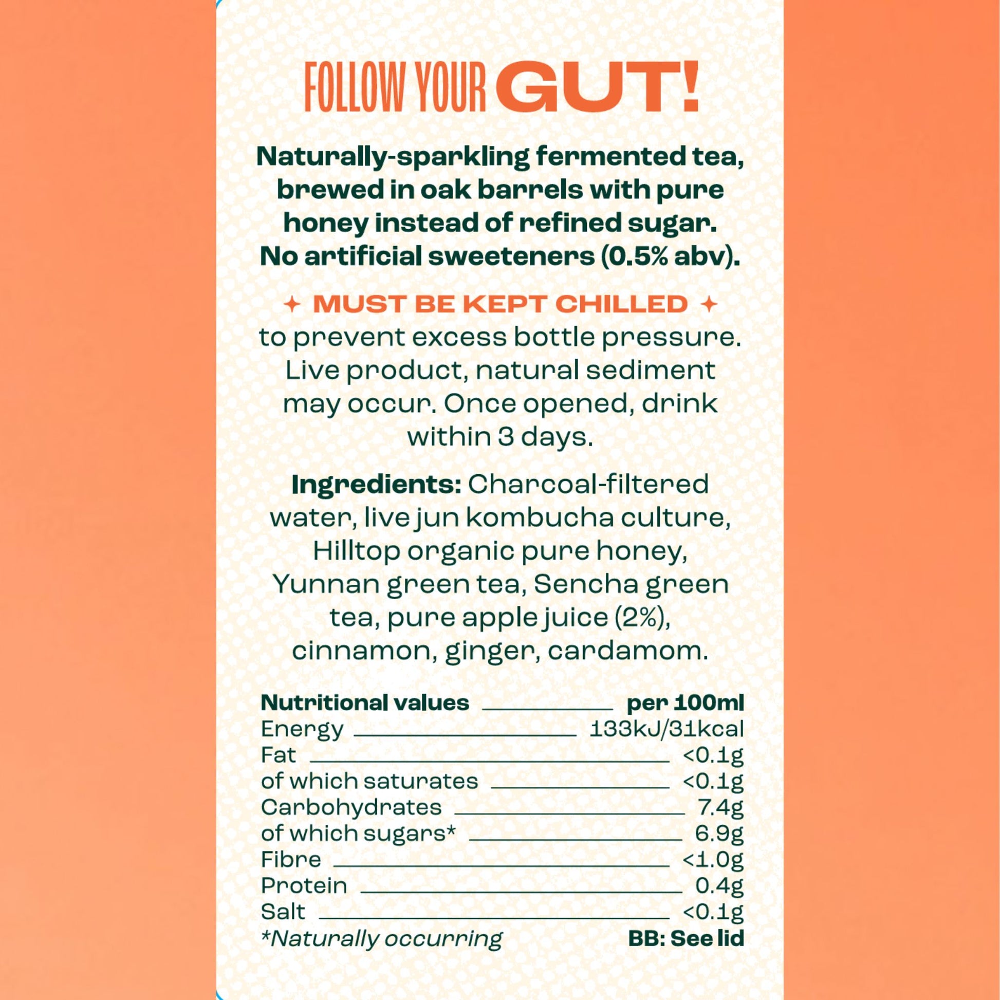 Unopened bottles have a best before date of 4 months from production when stored in the fridge (check the date on the cap). Once opened, drink within 3-5 days for best flavour and fizz. Jun is a live product so it continues fermenting slowly - it becomes more tart over time but remains safe to drink.